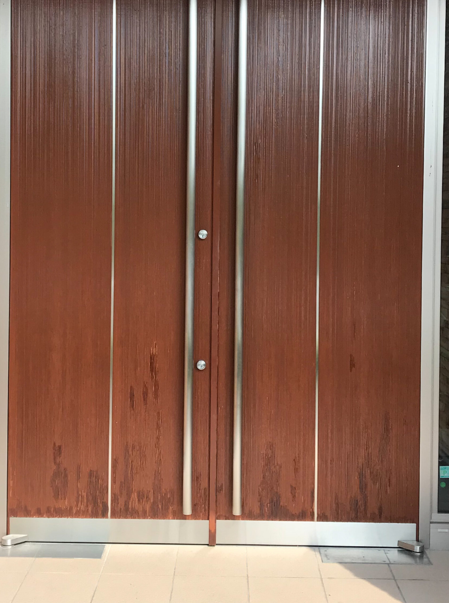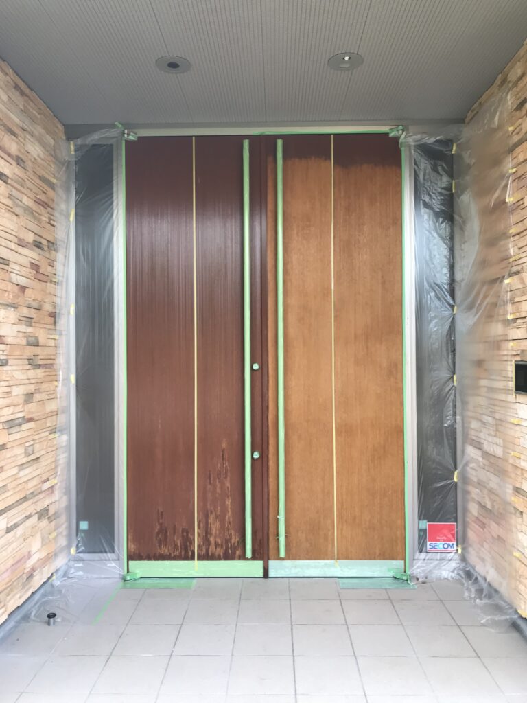 | コメント:愛知県内のとある豪邸です、玄関ドアの補修です。 重量級の超高級なドアです、塗装業者がさじを投げたほど難しい仕事です まずは剥離から、下部は木部が毛羽立つほどひどく痛んでおります、 薬剤とサンダーで丹念に剥離してまいります、 かなりの時間と体力を要します、、、 三日かけて剥離が終わり四日目は塗装に入ります、、、 元色に仕上げてまいります、 下塗り1回、中塗り2回、上塗りウレタン2液を二回吹き付けてまいります 途中硬化を待って研磨作業も必要になります。 気温39度もの気温も幸いして早く乾いていきます、 最後の取り付け作業もうまくいきまして完了となりました ご主人様にも喜んでいただきまして帰社となりました とても素晴らしいお客様に毎日のように恵まれまして感謝しきりです、、、 今回も補修で完璧になおりました、ここで直らない場合はドアごと取替え作業となります、材料の手配、職人さんの手配、搬入、施工、多大な費用(おそらく枠の交換込みで100万円コース)と時間を要します、 傷補修工事で済めば大幅なコスト削減が実現できます |