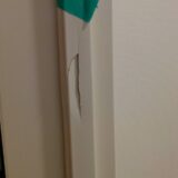 | コメント:たて枠の戸あたりです 大きく膨れていたところを除去してありました 作業手順 まずはバリ取りです 樹脂を入れて面出し 目をつぶって触って確かめます 完全に面が出たら ベース色の吹きつけ作業に入ります この段階で木目が消えてしまいましす 筆にて木目を再生 艶調整のため吹きつけ作業をして 完成となります 普段はここまではしませんが ご要望により応えさせていただきます |
