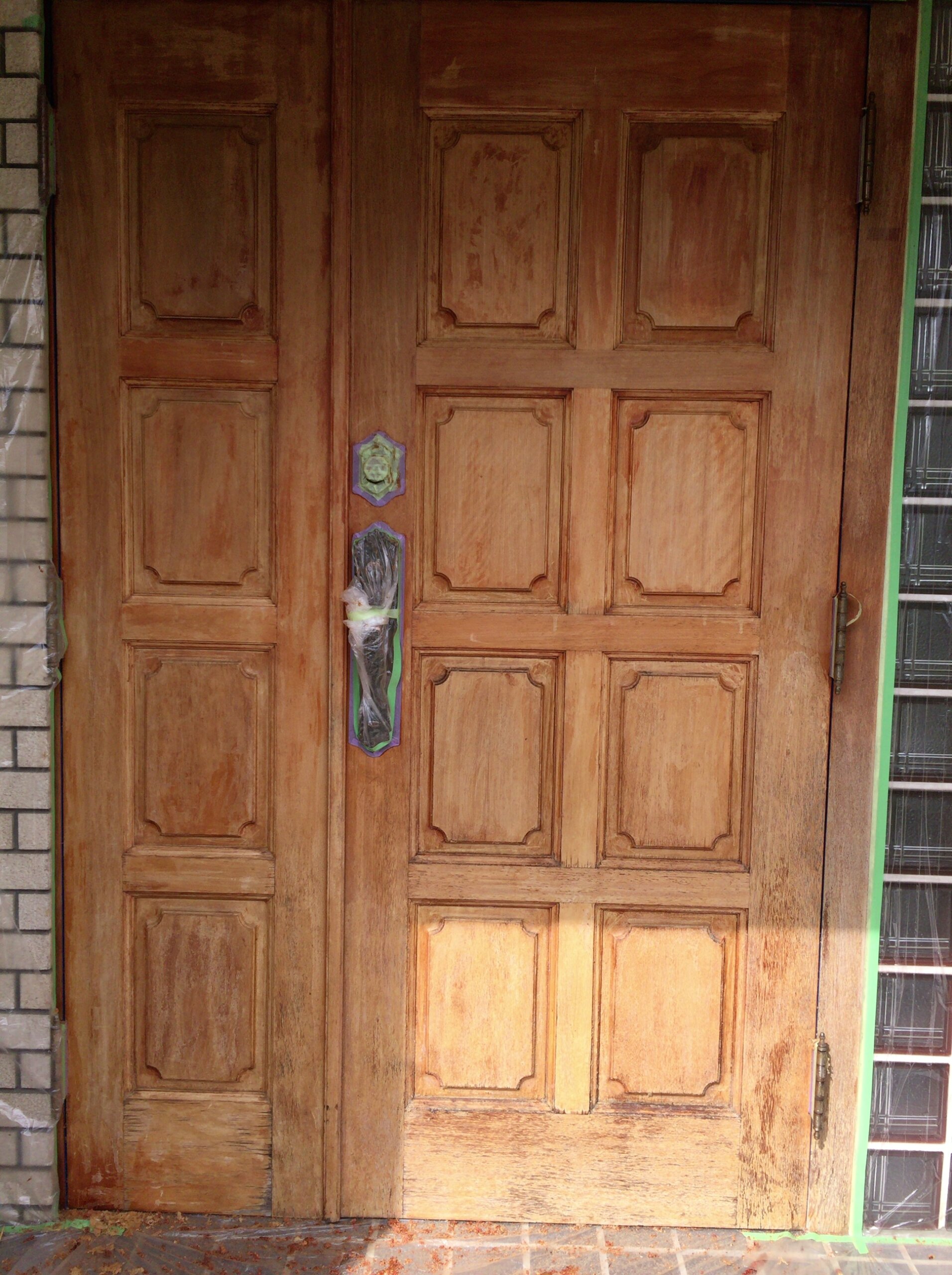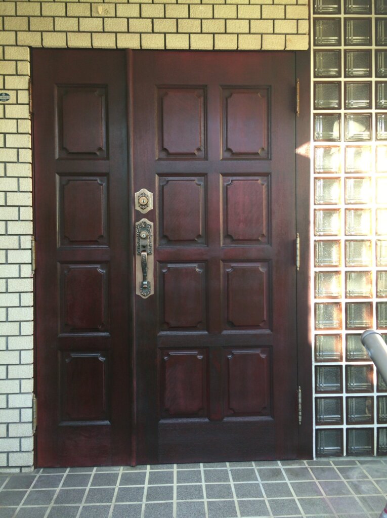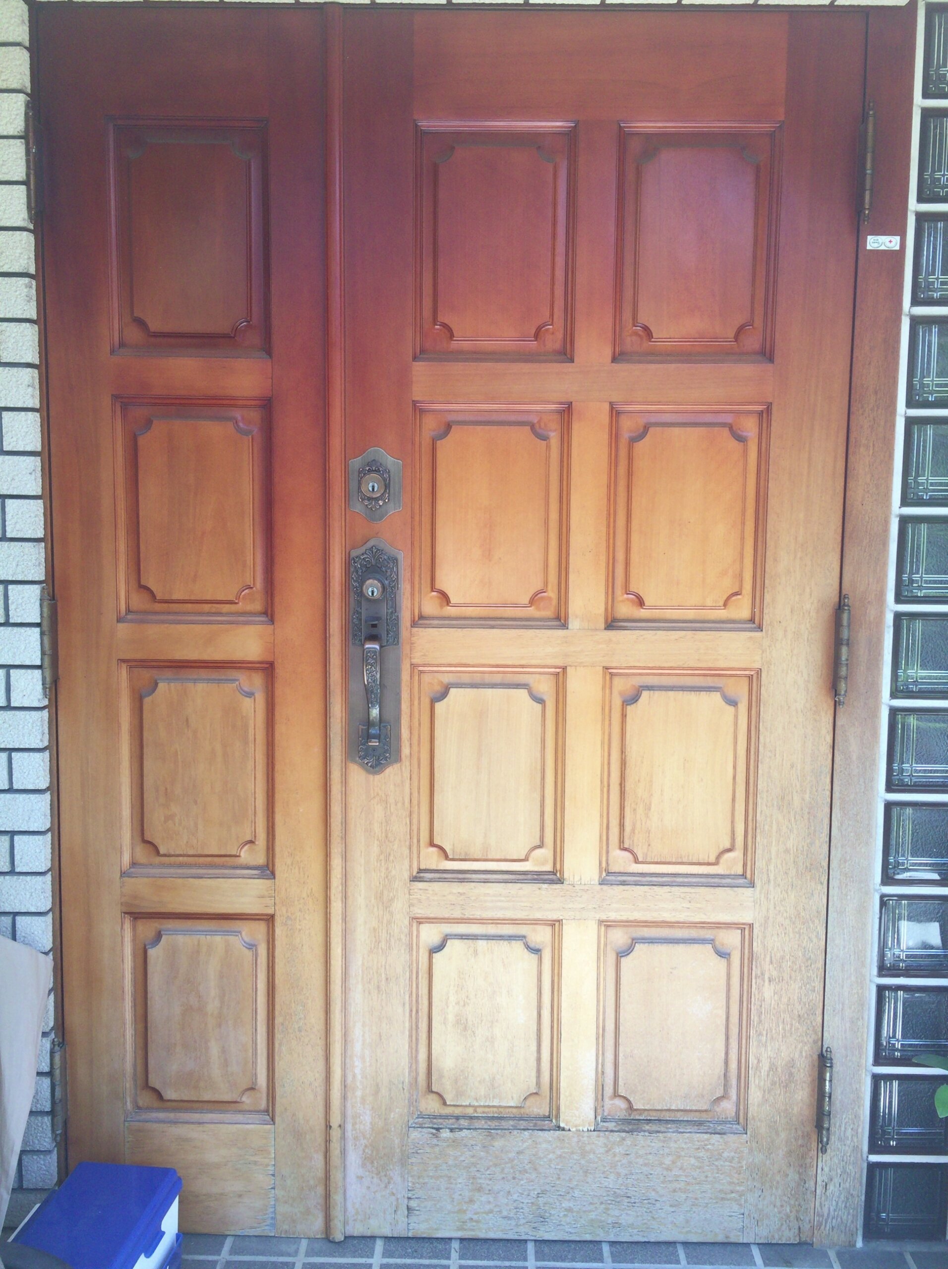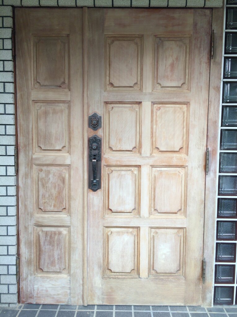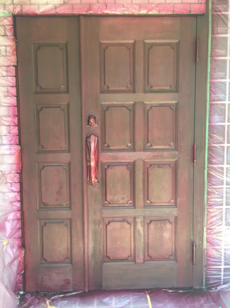 | コメント:愛知県内の元官僚様のお屋敷の玄関ドアの補修です。 まずは剥離から、塗装がかなり剥がれてしまっています、下部は木部が毛羽立つほど痛んでおります、 薬剤とサンダーで丹念に剥離してまいります、 凹凸部分の剥離作業がたいへんで、かなりの時間と体力を要します、、、 一日かけて剥離が終わり二日目は塗装に入ります、、、 元色に仕上げてまいります、 ローズ色に仕上げることになりました 下塗り1回、中塗り2回、上塗りウレタン2液を二回吹き付けてまいります 途中硬化を待って研磨作業も必要になります。 気温28度もの気温も幸いして早く乾いていきます、 最後の取り付け作業もうまくいきまして完了となりました 優しいご主人様と奥様と四方山話しに花が咲きました、、、 喜んでいただきまして帰社となりました とても素晴らしいお客様に毎日のように恵まれまして感謝しきりです、、、 今回も補修で完璧になおりました、ここで直らない場合はドアごと取替え作業となります、材料の手配、職人さんの手配、搬入、施工、多大な費用(おそらく枠の交換込みで100万円コース)と時間を要します、 傷補修工事で済めば大幅なコスト削減が実現できます。 |