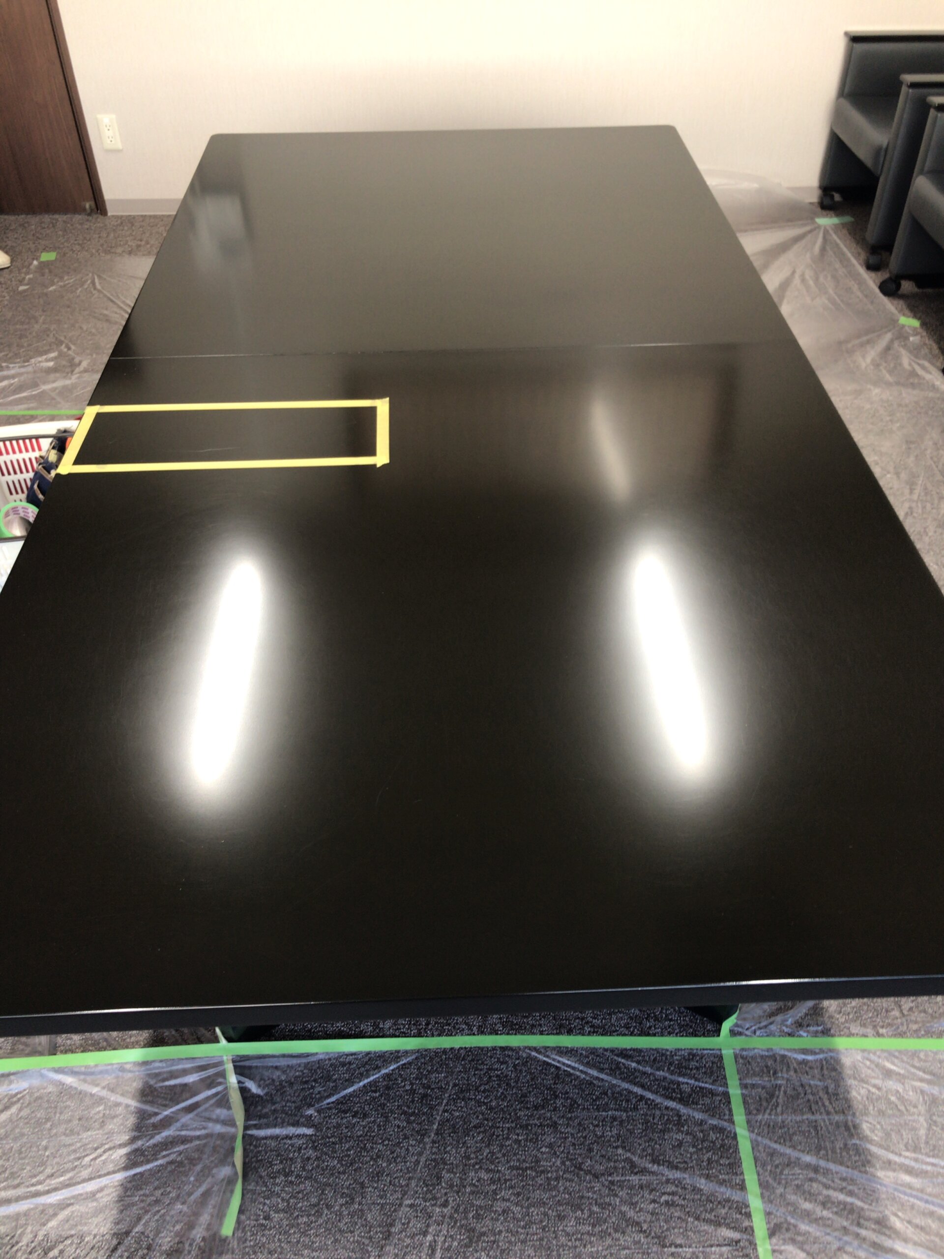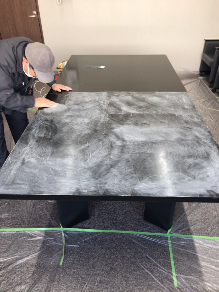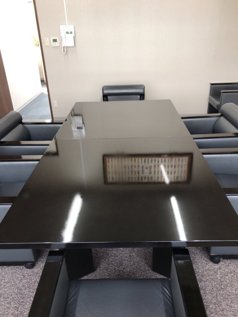 | コメント:会議室テーブルの補修依頼です 作業手順 表層の剥離 サンディングシーラー吹き付け 磨き上げ カラーステイン吹き付け ウレタンクリアー吹き付け 磨き上げ バフ仕上げ テーブルの他にも椅子の手掛け部分も磨き仕上げ |